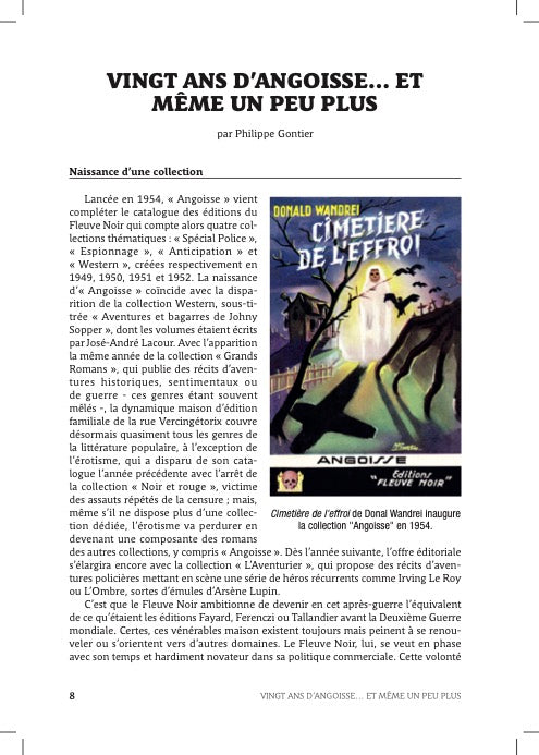 En 1954, les éditions Fleuve Noir lançaient une collection sobrement baptisée « Angoisse », dont les ouvrages privilégiaient « l’action, l’atmosphère, le suspense et le mystère », avec l’ambition affichée de procurer au lecteur « quatre heures d’émotion comme seul le cinéma avait réussi à en créer ». Durant ses vingt ans d’existence, qui virent l’apparition de la Hammer et du cinéma d’horreur italien, elle publia deux cent soixante-et-un romans relevant du fantastique, de la science-fiction ou du thriller, parfois mêlés.